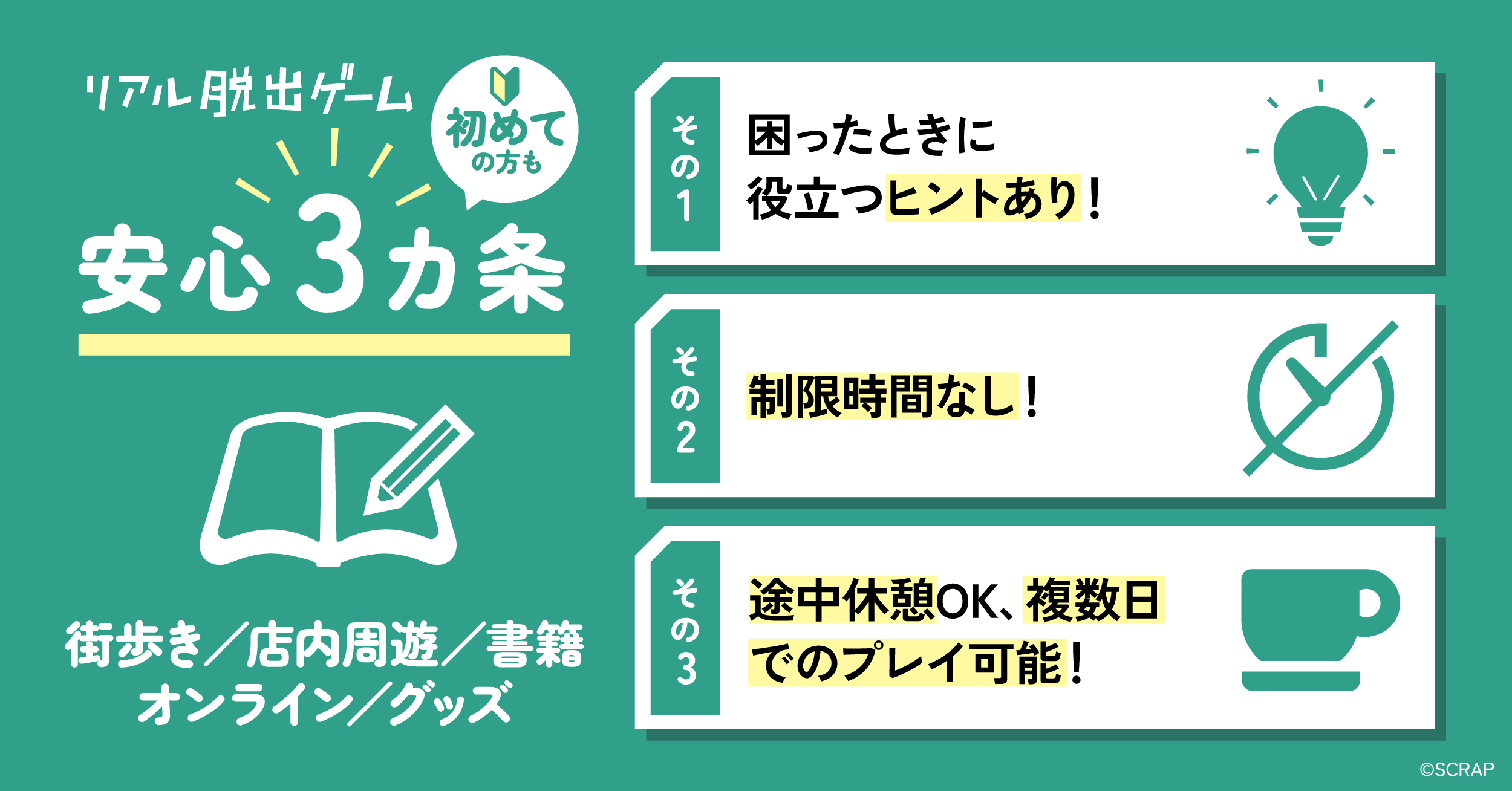 最後まで謎解きをお楽しみいただけるようヒントをご用意しております。初めての方でも安心してご参加ください。