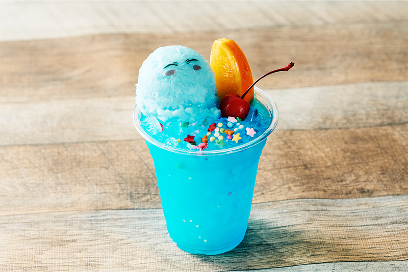 転生したらフロートになっちゃった件900円食材:ブルーライチシロップ/サイダー/ブルージュレ/ラムネソルベ/チェリー/オレンジ/星形シュガー/アラザン -