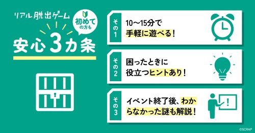 ・イベントの感想や謎解きに関わらない写真の投稿は大歓迎ですが、これからお楽しみいただくお客様のために、イベントの内容や配布物の詳細をブログやSNSなど、インターネット上に公開することは固くお断りいたします。